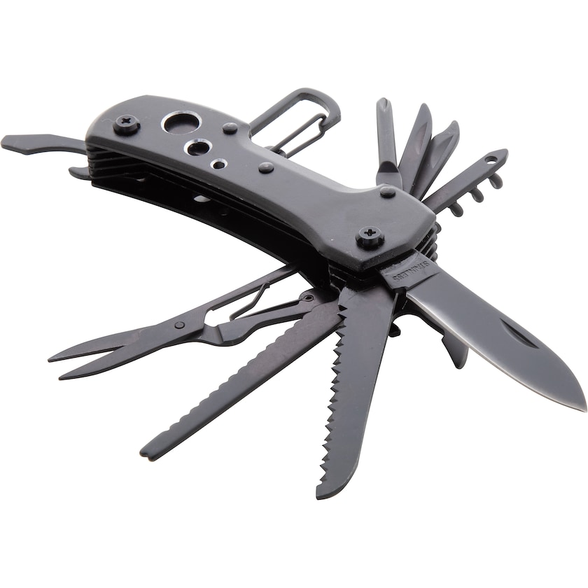 Täysmusta linkkuveitsi 13 toiminnolla. Elburn on valmistettu ruostumattomasta teräksestä lukuun ottamatta kahvaa, joka on valmistettu alumiinista. Merkintä voidaan tehdä joko laserkaiverruksella tai 2-väripainatuksella.