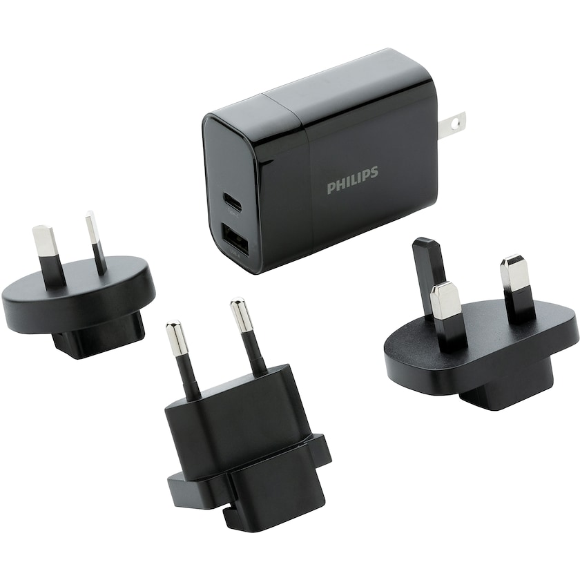 Tehokas Philips-matka-adapteri. Tuotteet toimitetaan kätevissä säilytyspusseissa. Matka-adapterissa on kolme pistoketta: integroitu USA-pistoke ja vaihdettavat Australian, Iso-Brotannian ja EU:n pistokkeet. Tuotteet on pakattu Philipsin tuotepakkauksiin. Painatuksen saa myös säilytyspussiin, jossa painoala on 90 x 40 mm.