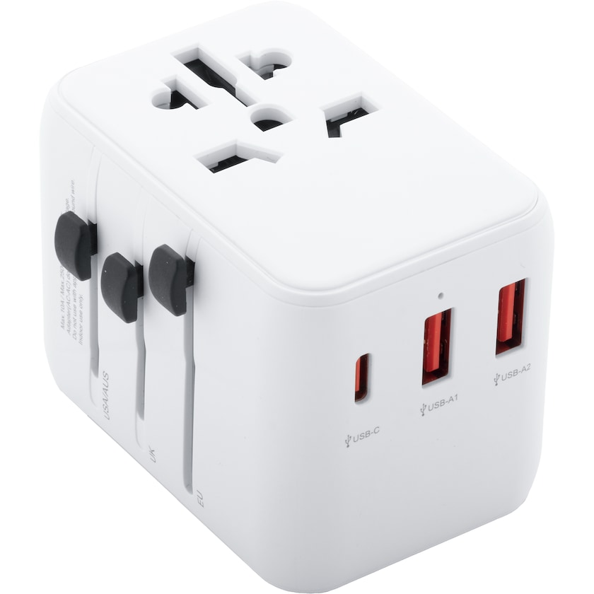 Matka-adapteri pikalatauksella. Nagano-matkasovittimessa on liitäntä Yhdysvaltoihin, Eurooppaan, Isoon-Britanniaan ja Australiaan sekä 2 kpl USB-liitäntää ja 1 kpl USB-C-liitäntä nopeaa latausta varten.