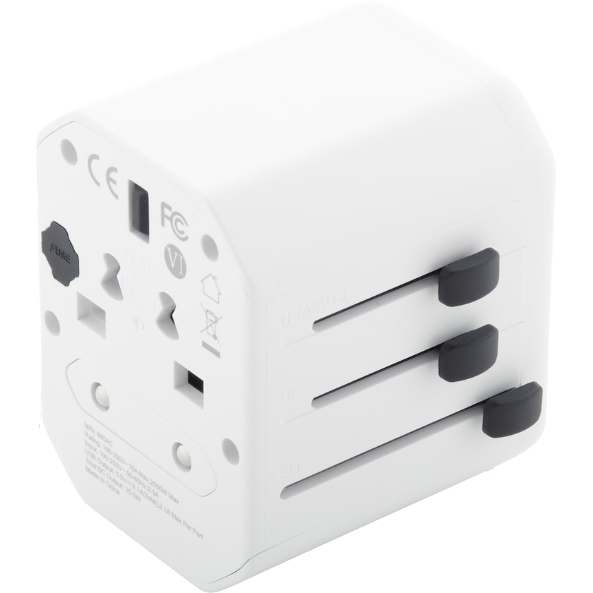 Edullinen matka-adapteri omalla painatuksella. Adapterissa mukana liitännät Yhdysvaltoihin, Eurooppaan, Iso-Britanniaan ja Australiaan sekä USB- että USB-C-liitännät.