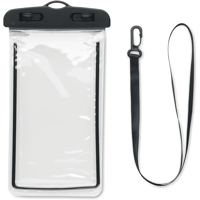 Vedenpitävä matkapuhelintasku irrotettavalla hihnalla. Puhelintasku on vedenpitävä IPX 6 mukaan. Sopii puhelimiin, joiden näyttö on enintään 6,7 tuumaa. Vain 1-väripainatus on mahdollista.
