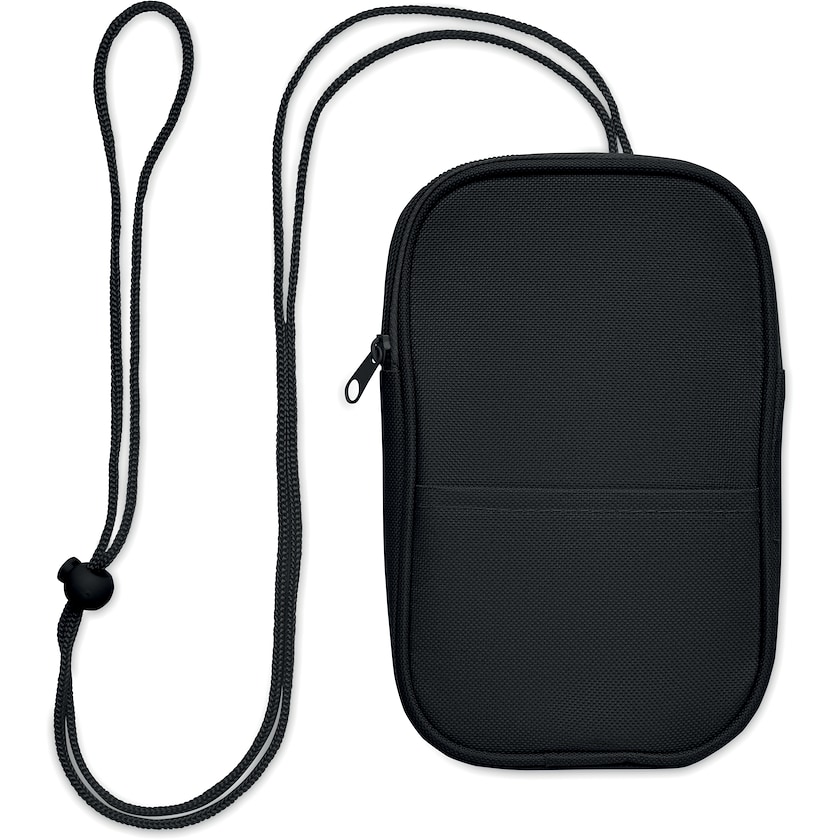 Edullinen kierrätetystä materiaalista valmistettu kännykkälaukku. Laukussa on vetoketjullinen päälokero. Kaulanauha on säädettävä.