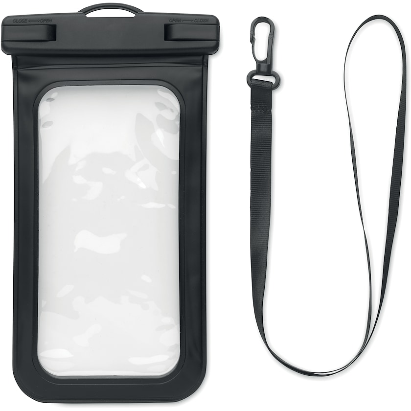 Vedenpitävä matkapuhelintasku irrotettavalla hihnalla. Vesitiivis luokituksen IPX 8 mukaan. Sopii matkapuhelimiin, joissa on enintään 6,7 tuuman näyttö. Vain 1-väripainatus on mahdollista.