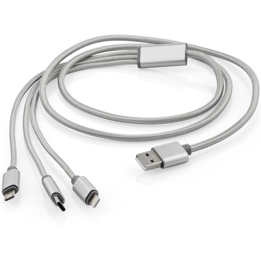 Puhelimen kaapeli kolmella liittimellä. Mega-kaapelissa on C-liitin, mikro-USB-liitin sekä iPhone 5:n ja uudempiin Applen malleihin sopiva liitin. Merkkaus ainoastaan laserkaiverruksena.