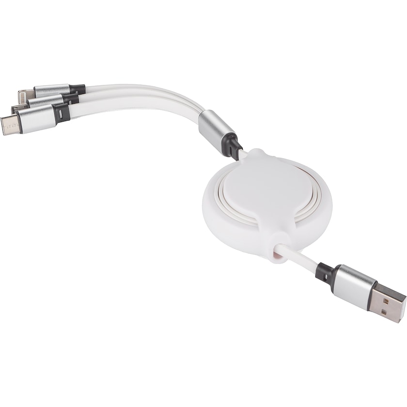 Kelautuva 3-in-1 -kaapeli. Sisältää C-tyypin, lightning- ja mikro-USB-liittimet. Avattuna johdon pituus on 115 cm.