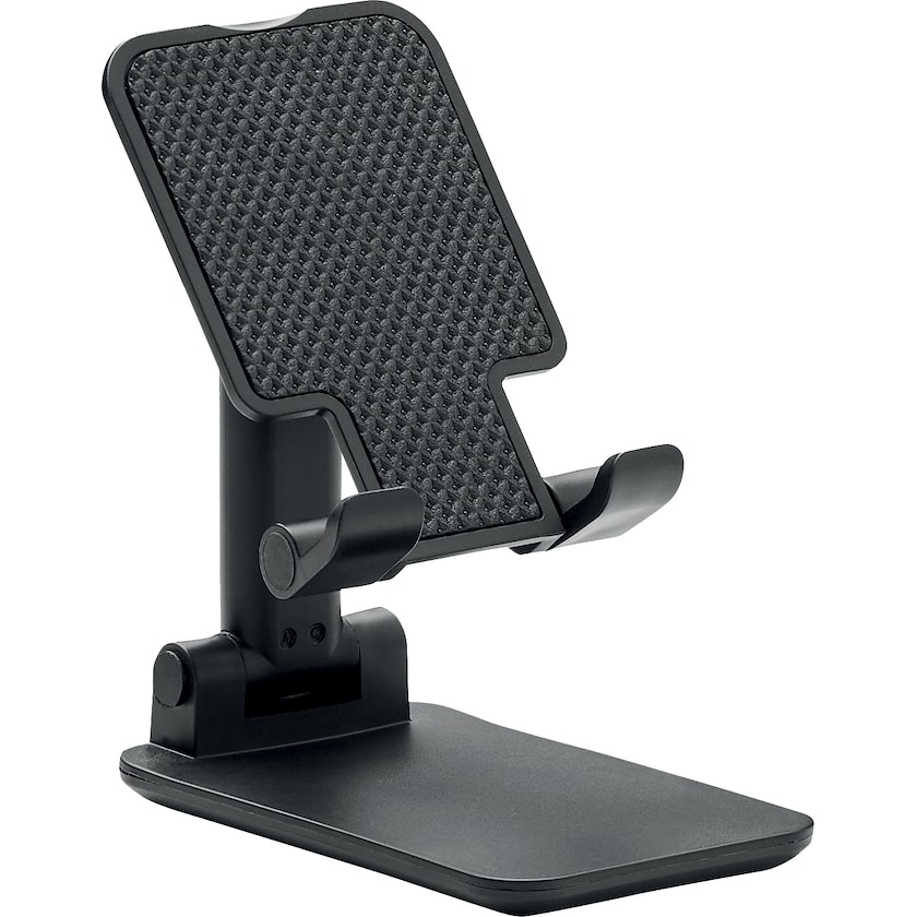 Älykäs puhelimen teline painatuksella. Kun puhelinteline ei ole käytössä, se voidaan taittaa tilan säästämiseksi.