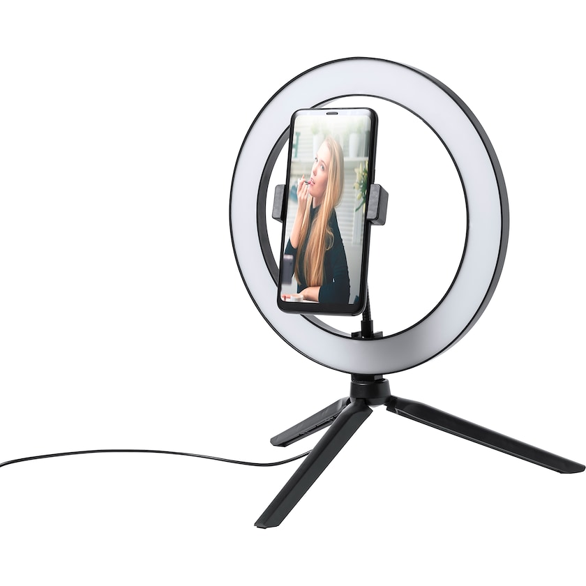 Pyöreä valaisin valokuvaukseen, videokuvaukseen ja videopuheluihin. Aseta kännykkä telineeseen, säädä valo ja saat täydellisen valaistuksen selfieesi tai videopuheluusi. Mukana USB-latauskaapeli. Lampun korkeus on säädettävissä.