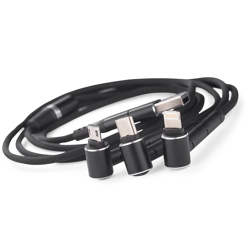 Puhelimen latauskaapeli useilla eri liittimillä. Kaapelissa on USB-A ja USB-C input, ja mikro-USB, USB-C sekä lightning (iPhone) output. Output-kaapeleissa on vahvistettu osa, jonka ansiosta ne toimivat myös kännykkätukena.