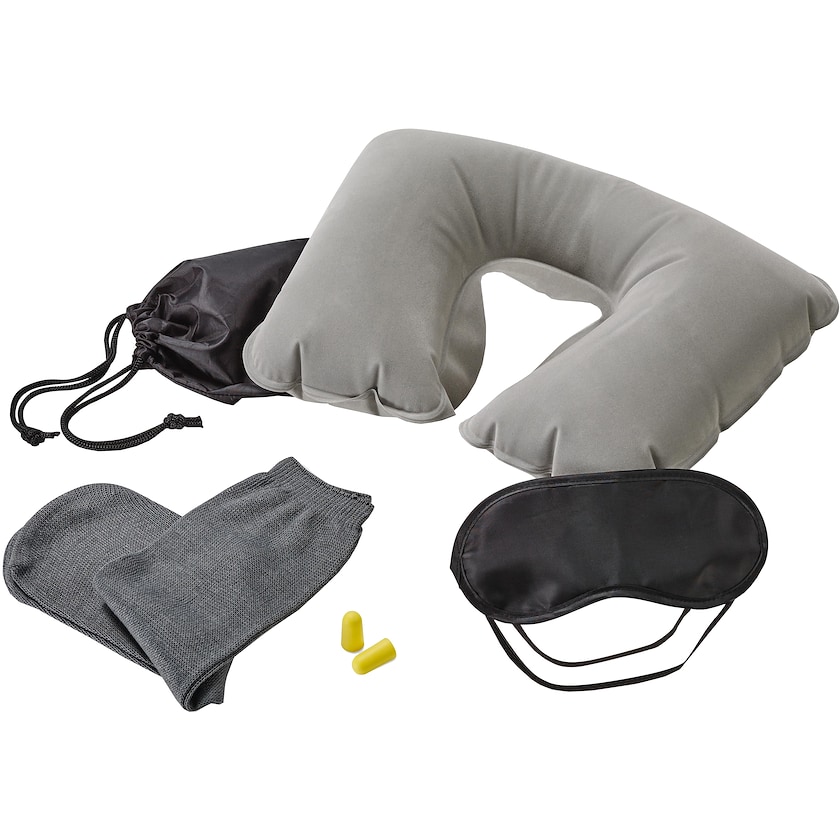 Matkasetti, joka sisältää kaiken tarpeellisen matkaa varten. Setti sisältää puhallettavan niskatyynyt, unimaskin, korvatulpat ja sukat. Toimitetaan mustassa säilytyspussissa.