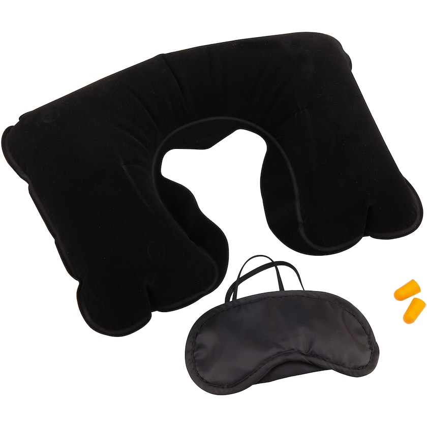 Kivaan matkasettiin sisältyvät niskatyyny, silmälaput ja korvatulpat. Matkalle mukaan!