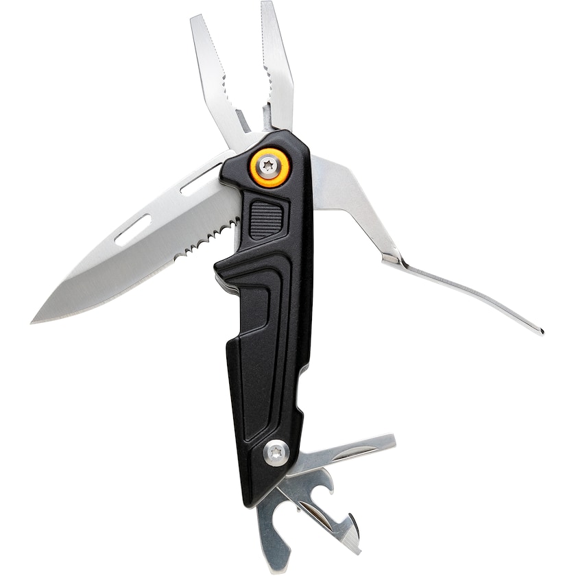 10 toiminnon työkalu suojakotelossa. Työkalu on alumiinia ja ruostumatonta terästä.