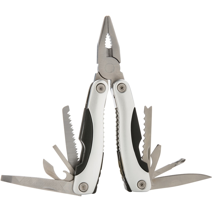 Alumiininen työkalu 14 toiminnolla. Mukana säilytyskotelo.