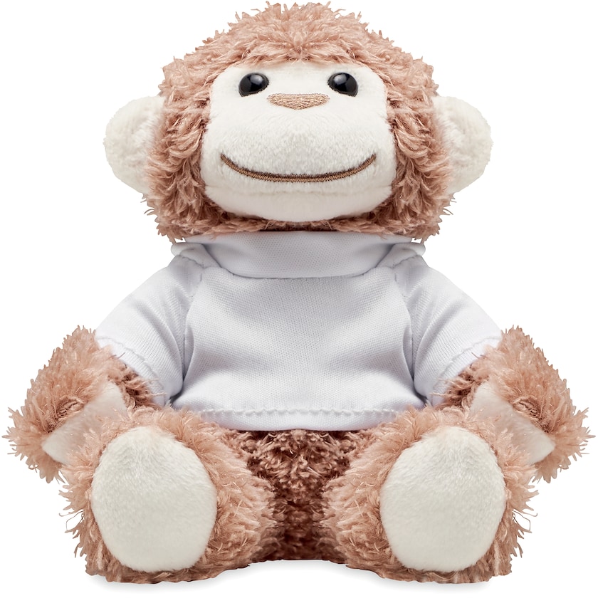 Iloinen ja halattava apina valkoisessa hupparissa. Painatus tehdään huppariin.