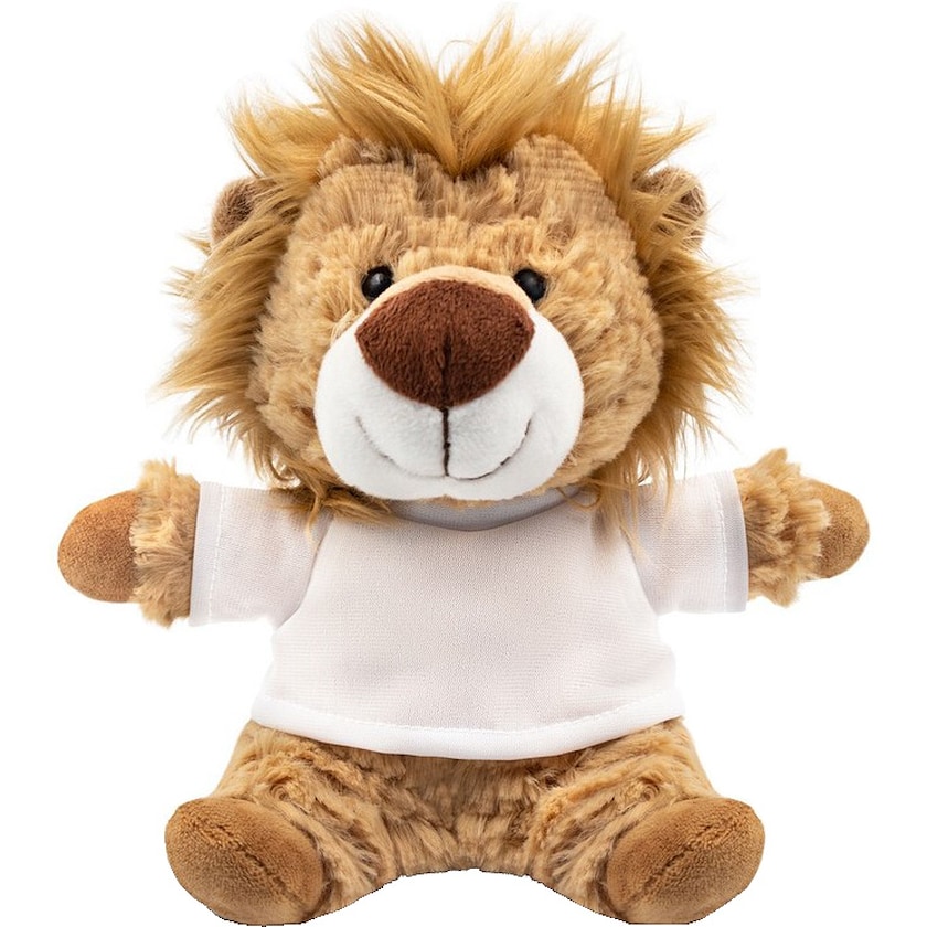 Leijona, joka on sekä ystävällinen että pehmeä. Painatus tehdään valkoiseen t-paitaan. T-paita toimitetaan erillään pehmolelusta.