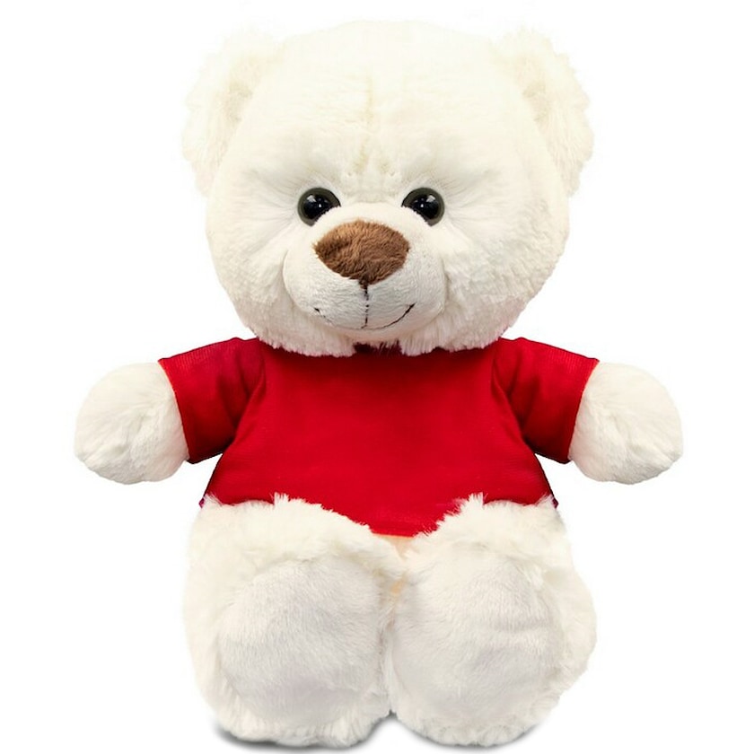 Suuri valkoinen pehmonalle, jolla on punainen t-paita. Korkeus 27 cm. T-paidat toimitetaan erikseen pakattuina, ja ne tulee pukea nallejen päälle itse.