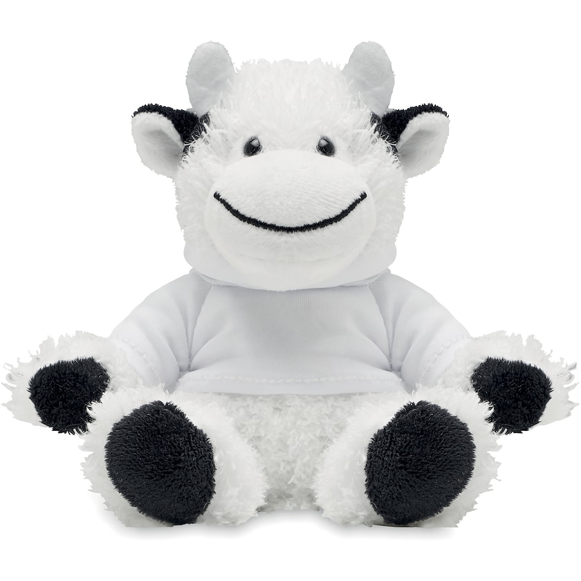 Suloinen lehmä, jolla on valkoinen huppari. Painatus tehdään huppariin. Täydellinen lapsille, jotka pitävät lehmistä.