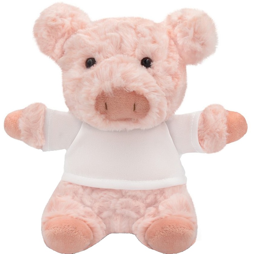 Pehmolelu söpön porsaan muodossa. Oswaldilla on valkoinen t-paita, johon painatus tehdään. T-paita toimitetaan erillään pehmolelusta.