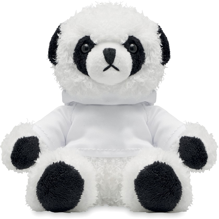 Söpö panda valkoisessa hupparissa. Huppu voidaan vetää ylös. Painatus tehdään huppariin.