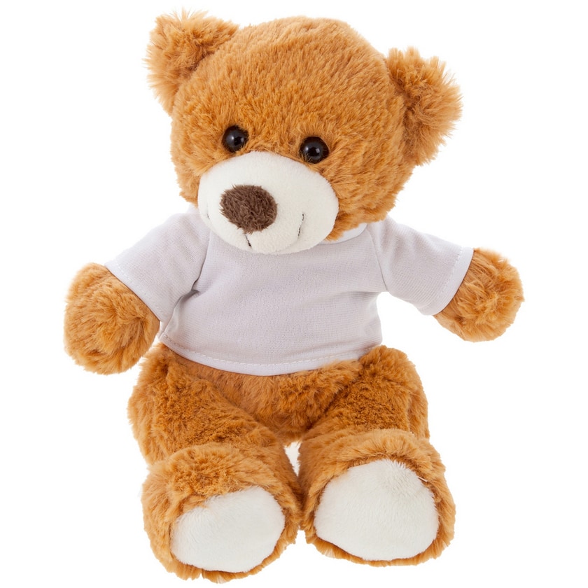 Pieni pehmolelunalle, jonka päällä valkoinen t-paita. Painatus tehdään nallen valkoiseen paitaan 1-4:llä Pantone-värikartan sävyllä. Paidat toimitetaan erillisessä pakkauksessa.
