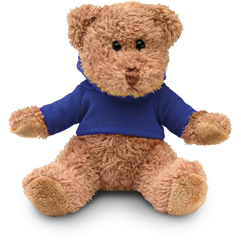 Pehmeä nalle, jolla on päällä huppari. Painatus huppariin. Kestävä ja luotettava ystävä!