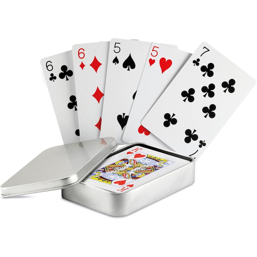 Korttipeli metallirasiassa. Sisältää 54 korttia. Painatus tehdään metallirasiaan.