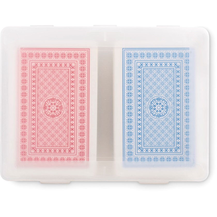 Kahden korttipakan setti omalla painatuksella. Jokaisessa pakassa on 54 korttia ja niissä on sininen ja punainen takaosa. Toimitetaan kierrätetystä polypropeenista valmistetussa laatikossa.