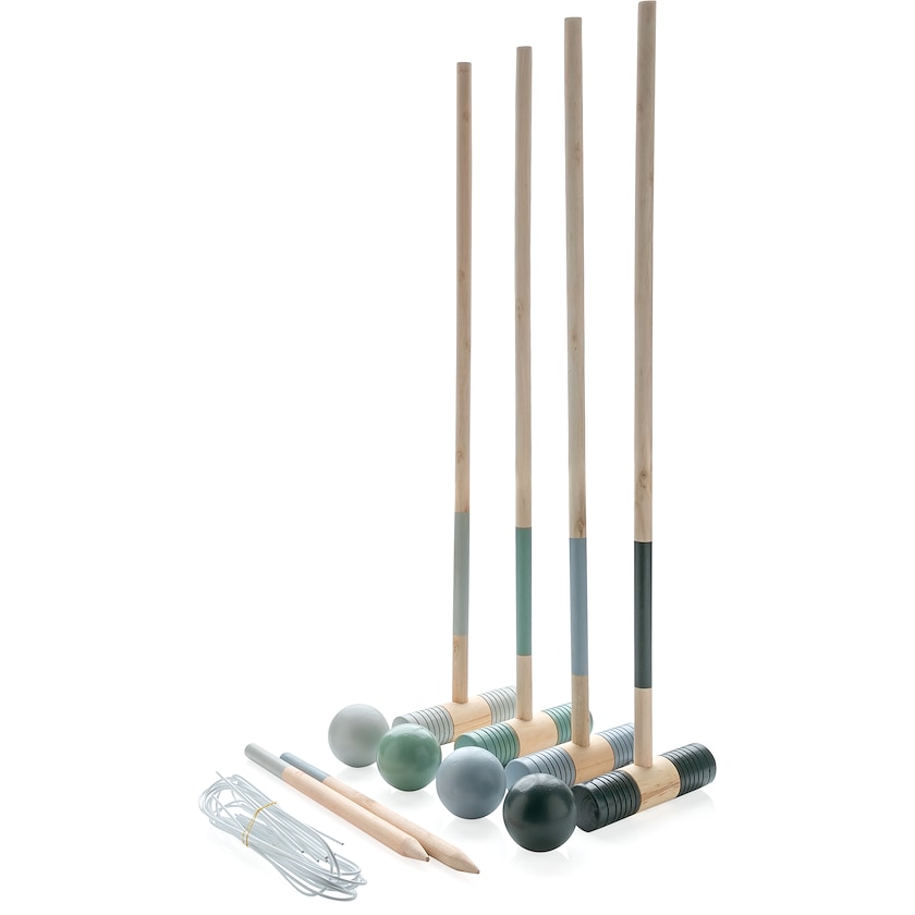Kaunis krokettipeli. Setti sisältää 4 mailaa, 4 palloa, 2 maalitikkua ja 10 metalliporttia. Paketissa on mukana säilytyspussi sekä ohjekirja. Painatus tehdään säilytyspussiin.