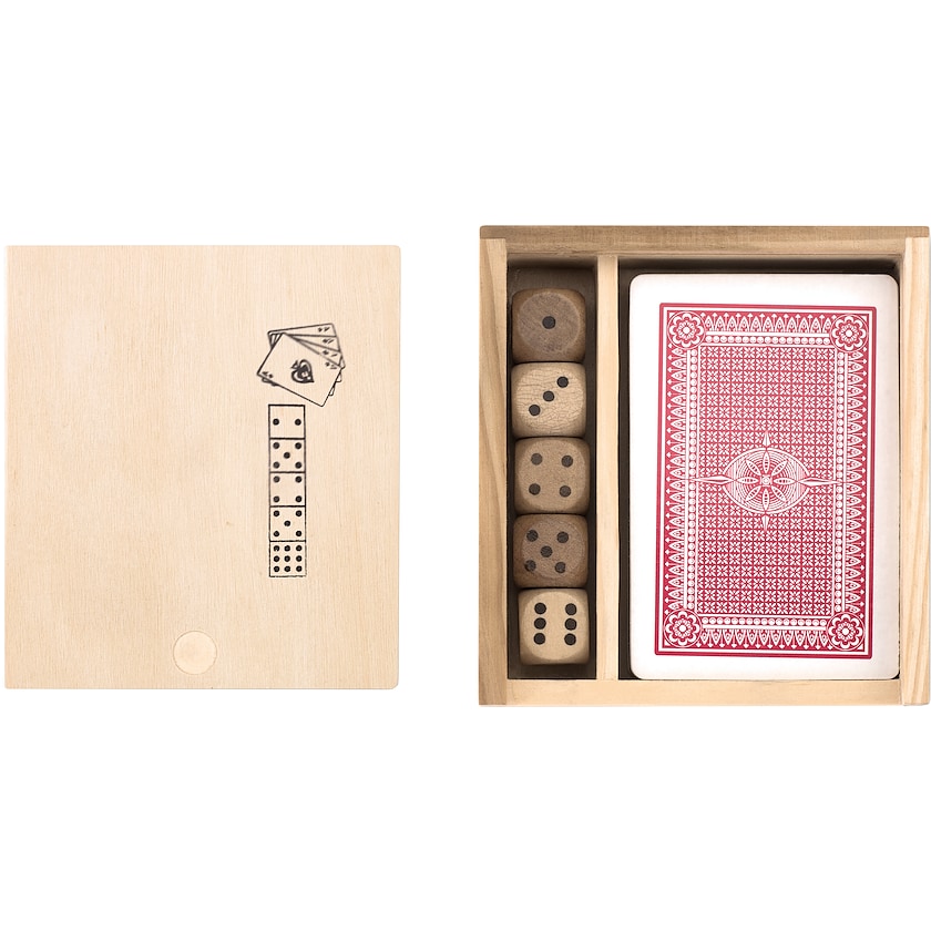 Korttipakan ja viiden nopan setti. Korttipakka sisältää 54 korttia. Tuotteet toimitetaan tyylikkäässä puisessa säilytyslaatikossa. Pelisetti, joka sopii joka kotiin!
