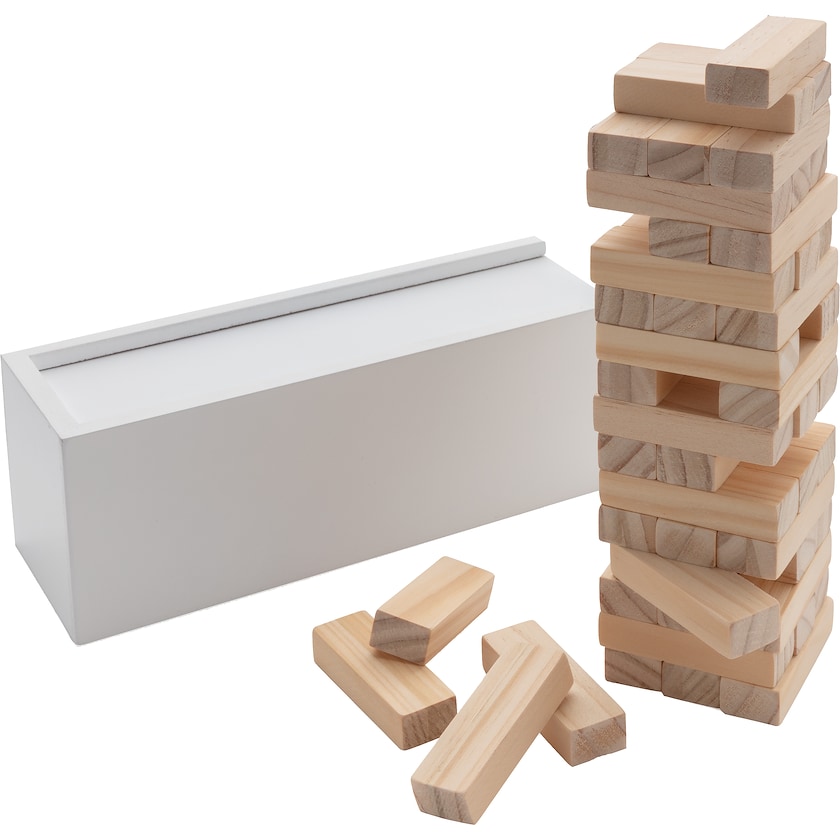 FSC-sertifioidusta puusta valmistettu Jenga-peli. Setti sisältää 48 rakennuspalikkaa. Toimitetaan valkoisessa puisessa säilytyslaatikossa.