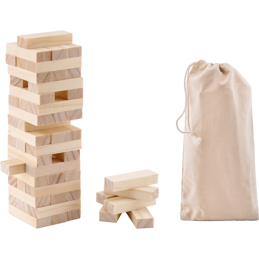 Puinen Huojuva torni-peli. Peli sisältää 54 puupalikkaa. Mukana puuvillainen säilytyspussi. Painatus tehdään pussiin. Hauska peli, joka vaatii sekä taktiikkaa että vakaita käsiä.