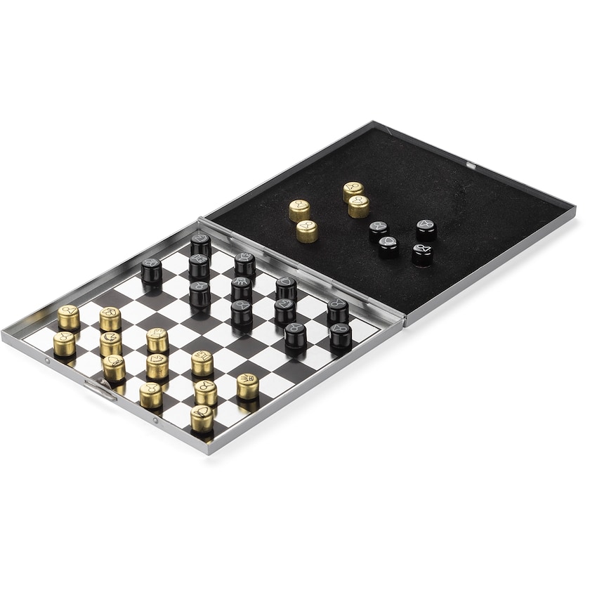 Elegantti minimalistinen shakkipeli. Pienen kokonsa ansiosta pelin voi ottaa mukaan matkalle tai rannalle. Pelinappulat ovat magneetteja ja kaikki pelin osat on valmistettu alumiinista. Tuotteet toimitetaan harmaissa pahvipakkauksissa. Merkkaus laserkaiverruksena tai painatuksena.