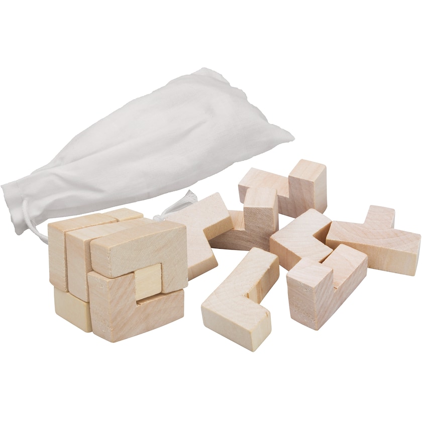IQ-peli puusta luonnonvalkoisessa puuvillapussissa. Edullinen älypeli, johon saa painatuksen tai laserkaiverruksen. Painatus tehdään säilytyspussiin ja kaiverrus puisiin osiin.