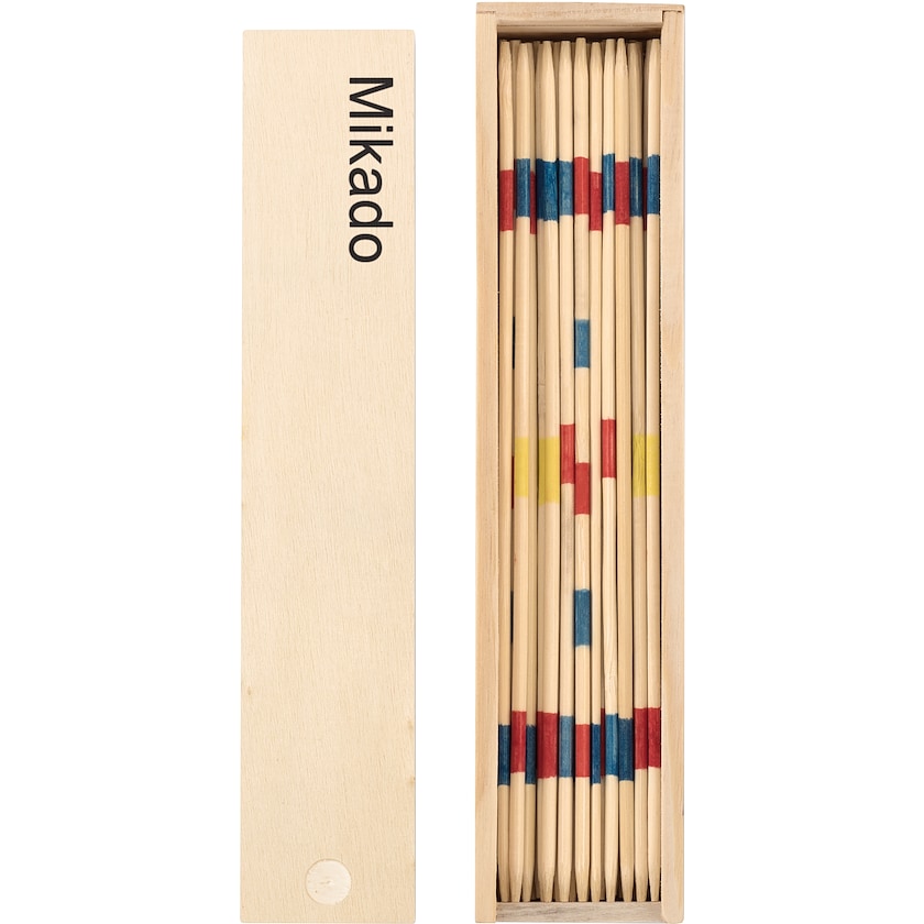 Mikadopeli puisessa laatikossa. "Nosta tikku"-peli on klassikko, joka on viihdyttänyt ihmisiä jo useiden sukupolvien ajan. Merkkaus painatuksena tai laserkaiverruksena.