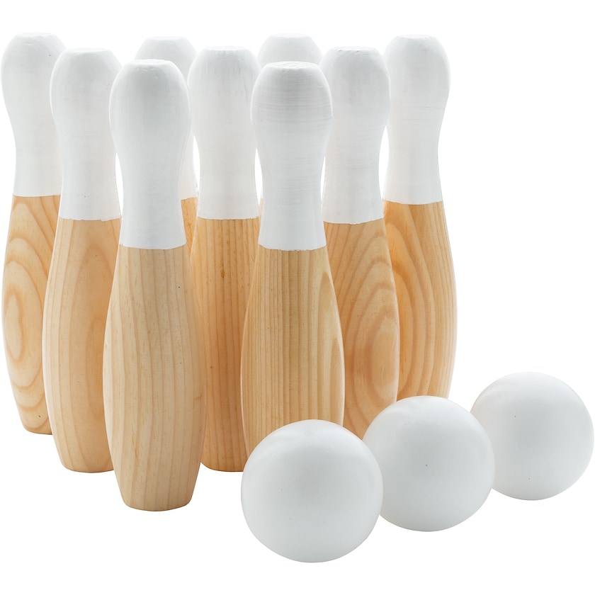Suosittu skittles-peli lapsille ja aikuisille. Männystä valmistettu setti toimitetaan kartonkilaatikossa ohjekirjan kanssa. Painatus tehdään mukana tulevaan puuvillapussiin.