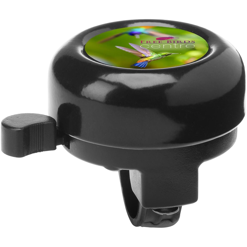 Pyörän soittokello. Herätyskello on metallia. Painatus tehdään digipainatuksena, ja sen päälle tulee suojaava epoksikerros.