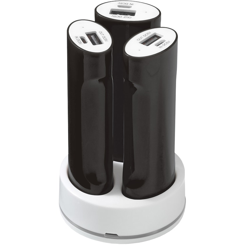 Kolmen virtapankin setti, jonka mukana toimitetaan latausasema. Virtaa koko perheelle! Mukana kaapeli latausasemaa varten. Jokaisen matkalaturin kapasiteetti on 2.200 mAh. Painatushinta koskee yhden virtapankin painatusta.