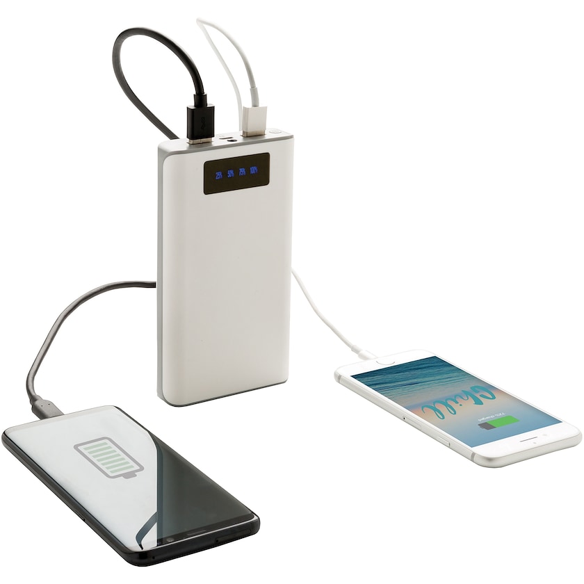 Huipputehoinen 10.000 mAh virtapankki. Laitteessa on näyttö, joka ilmaisee jäljellä olevan virran (25% / 50% / 75% / 100%). Kahden USB-portin avulla voit ladata kahta puhelinta samanaikaisesti. Output 5V/2.6A, input 5V/2A. Mukana mikro-USB-kaapeli.
