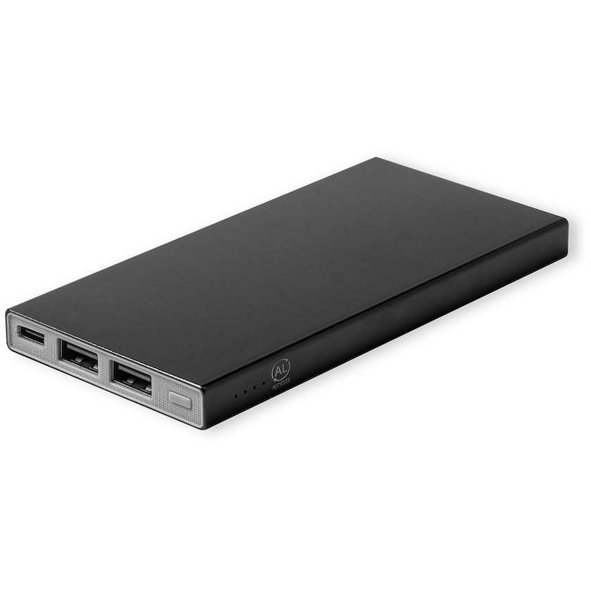 Kierrätetystä alumiinista valmistettu varavirtalähde. Powerbankissa on neljä diodia, jotka näyttävät jäljellä olevan energiatason. Mukana C-tyypin USB-kaapeli. Merkintä tehdään laserkaiverruksella.