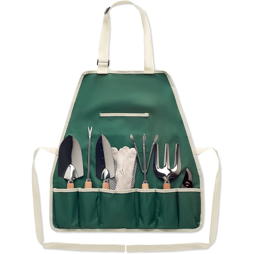 Puutarhavälineet kaikille viherpeukaloille. Taskuilla varustetu esiliina sisältää kaikki tärkeimmät puutarhurin välineet.