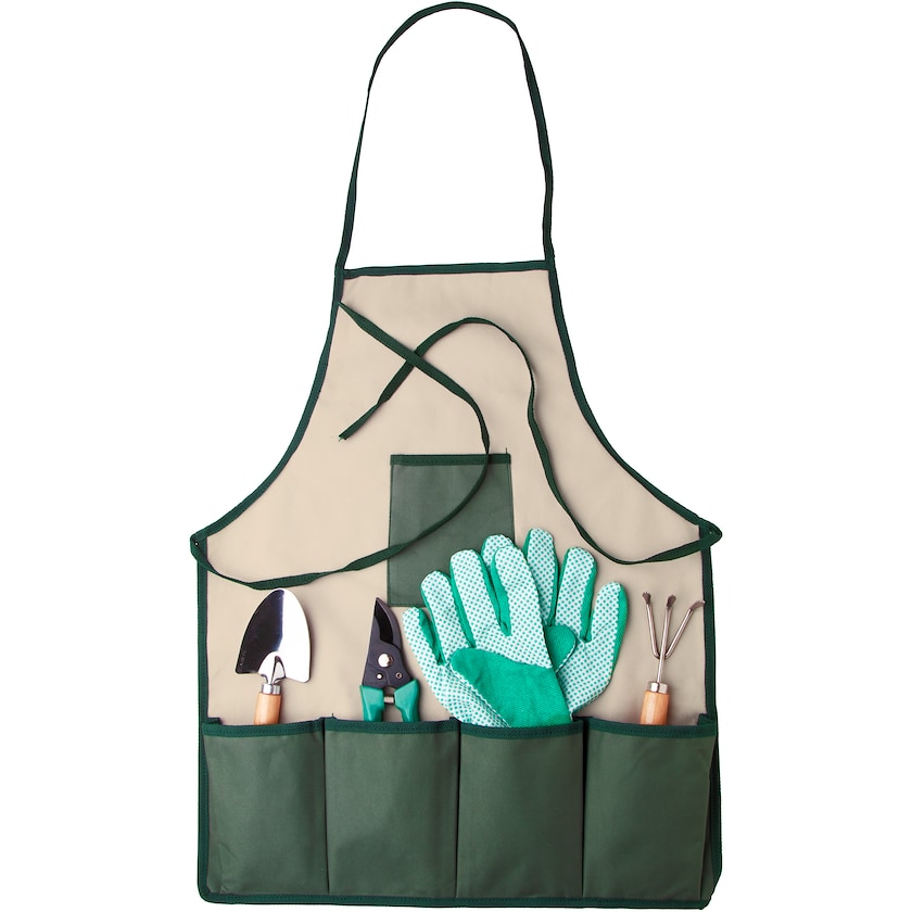 Puutarhurin tärkeimmät apuvälineet ja taskullinen essu. Setti sisältää essun, oksasakset, hanskat, lapion sekä käsiharan.