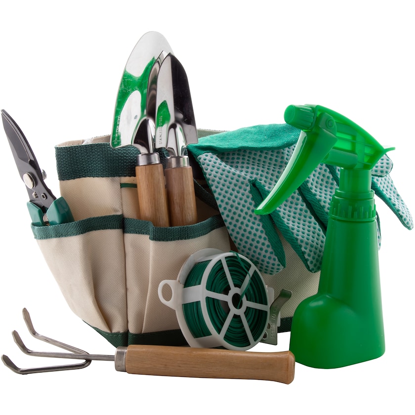 Monipuolinen puutarhurin apuvälinesetti kantokassiin pakattuna. Sisältää käsiharan, kaksi lapiota, oksasakset, hanskat, suihkepullon ja puutarhanarua.
