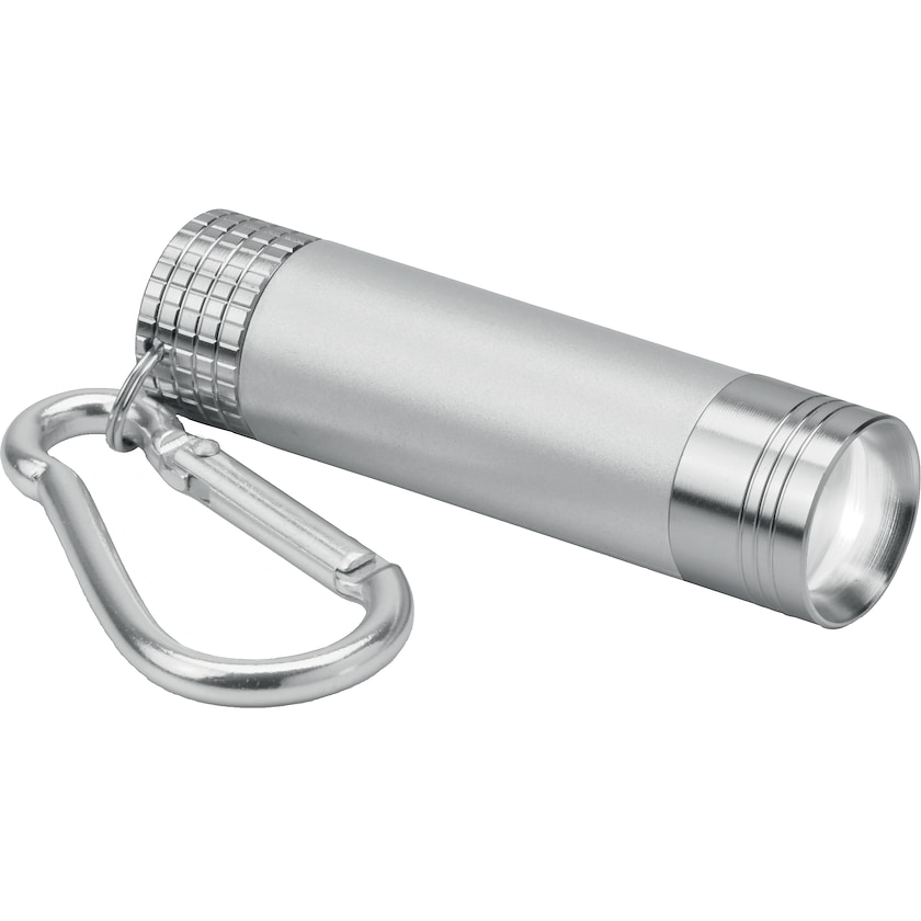 Pidennettävä taskulamppu, johon tehty logokaiverrus loistaa. Taskulamppu on valmistettu alumiinista ja toimii neljällä LR44-paristolla (paristot kuuluvat hintaan). Kaiverruksena tehty logo loistaa valkoisena.