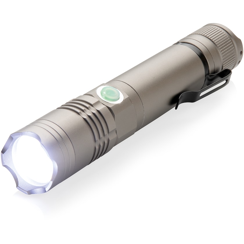 Ladattava 3W taskulamppu. Grayson valaisee jopa 200 metrin päähän, ja siinä on kolme asetusta: täysteho, puoliteho ja vilkkuvalo. Yhdellä latauksella lamppu toimii 8 tunnin ajan. Latausaika on n. 2 tuntia. Taskulamppu on IPX 4-luokiteltu, eli sitä voi käyttää huonossakin säässä. Mukana mikro-USB-kaapeli latausta varten.
