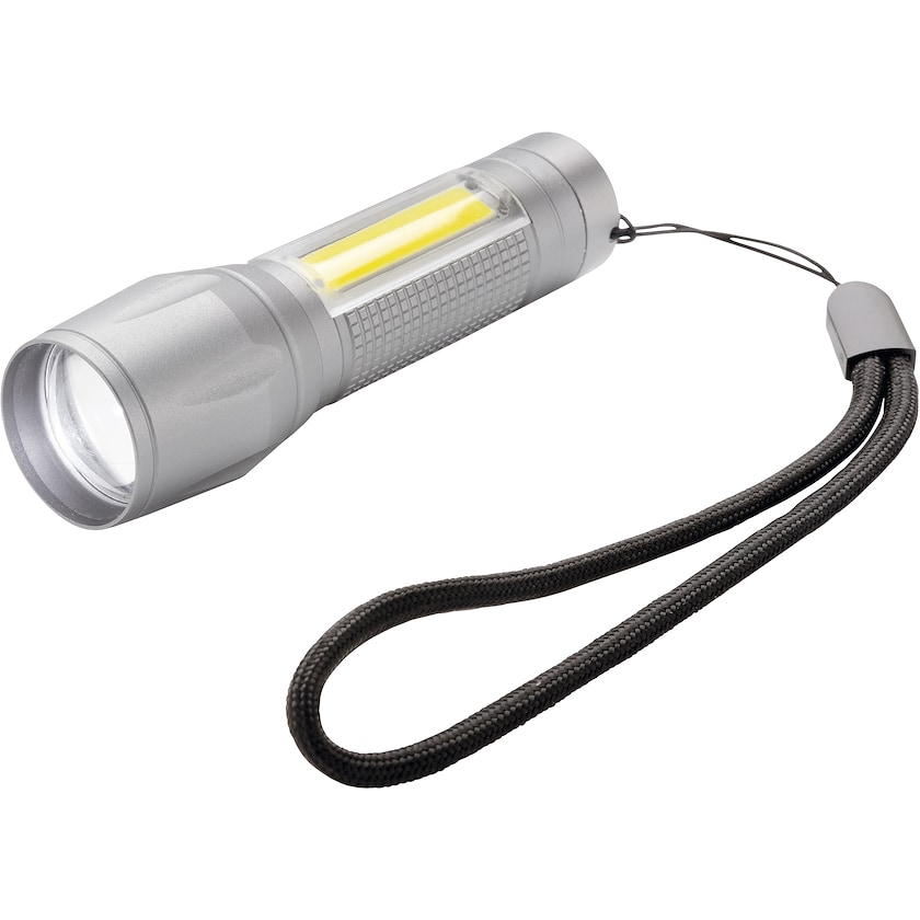 Pieni ja tehokas taskulamppu. Alumiinisessa taskulampussa on sekä LED- että COB-lamppu. Kolme eri valaisuasetusta. Paristot sisältyvät hintaan.