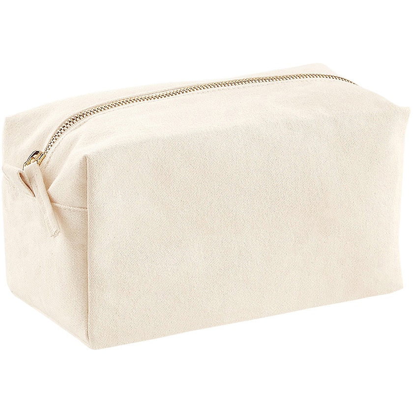 Luonnonvalkoinen toilettilaukku paksusta puuvillakankaasta. Pussissa on kaunis kultainen vetoketju ja sopivasti tilaa kosmetiikalle.