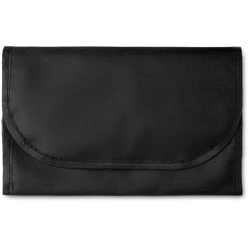 Meikkipussi painatuksella ja ripustuskoukulla. Vicenzassa on kolme lokeroa ja se voidaan taittaa kokoon, kun sitä ei käytetä. Täydellinen meikkipussi matkalle. Suuren painatuspinnan ansiosta painatukselle riittää paljon tilaa.