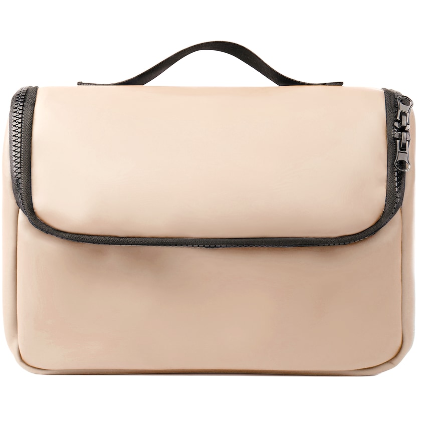 Toilettilaukku vettähylkivästä synteettisestä nahasta. Materiaali on helppo puhdistaa. Sisäpuolella on useita taskuja pienempiä tavaroita varten. Hygienialaukku on varustettu koukulla, jonka avulla sen saa ripustettua ylös.