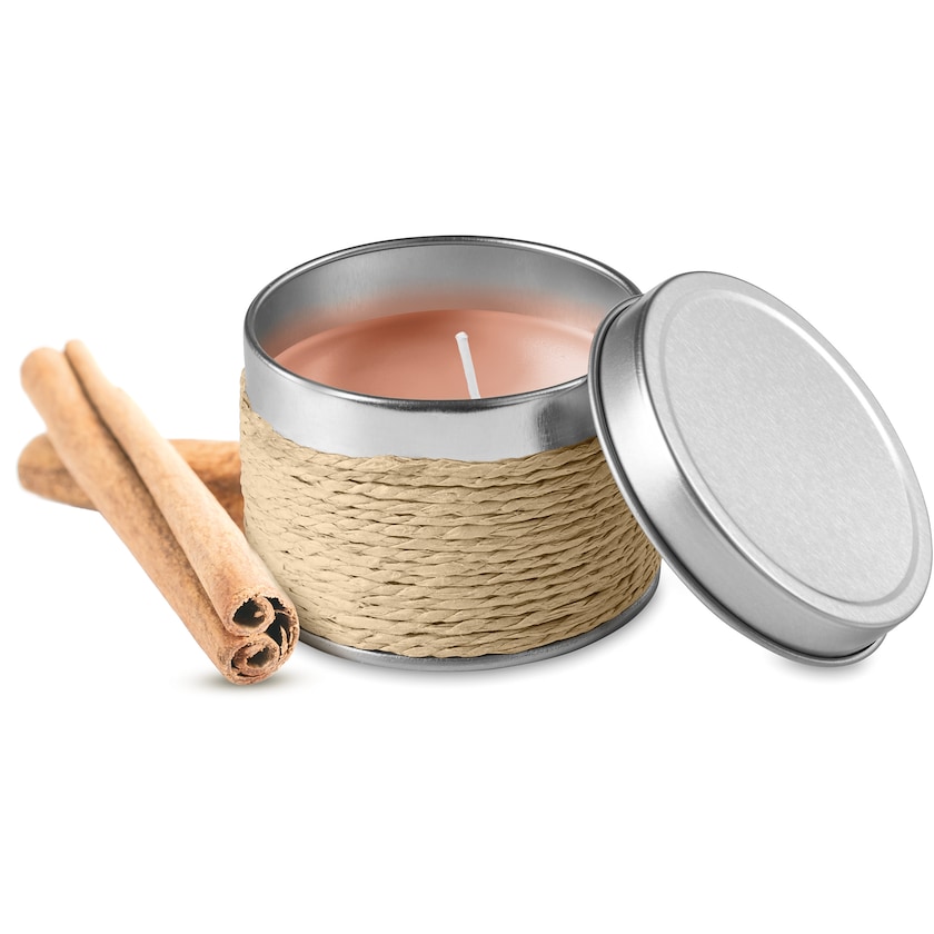 Tuoksukynttilä saatavilla useissa eri tuoksuissa. Valitse kanelin, kahvin, sitruunan, appelsiinin, vaniljan ja omenan tuoksuista. Merkintä tehdään painatuksella tai laserkaiverruksella kanteen.