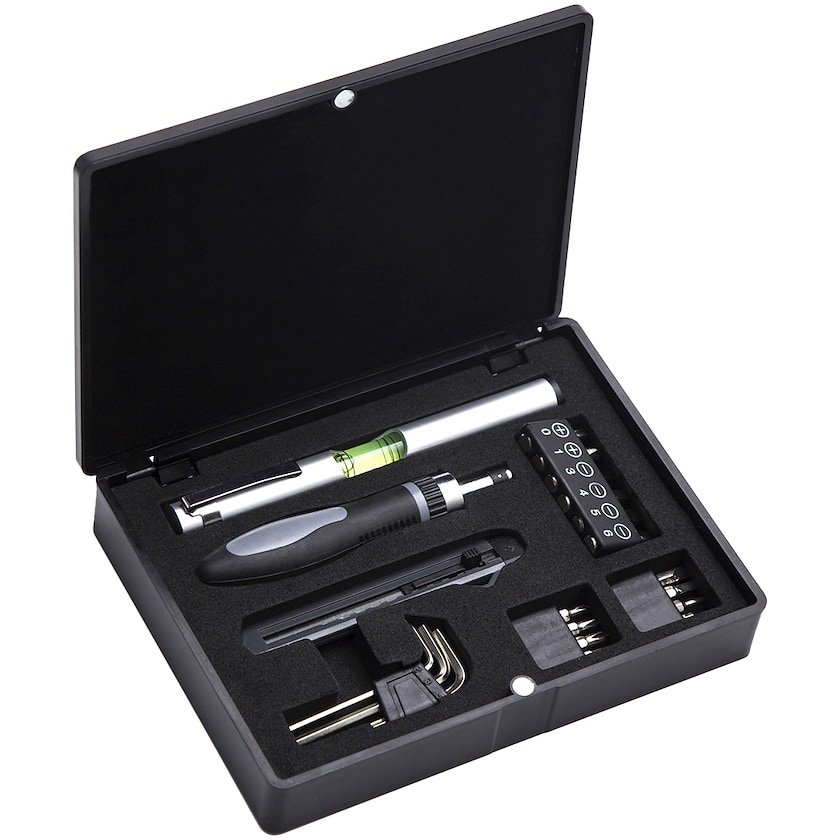 Työkalulaatikon voi kustomoida laserkaiverruksella. Näppärä setti sisältää työkalut kodin pieniin korjaus- ja asennustöihin.