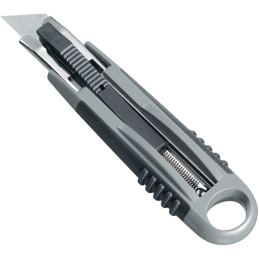 Korkealaatuinen tapettiveitsi pehmeillä kumisilla yksityiskohdilla. Automaattinen terän itsepalautus.